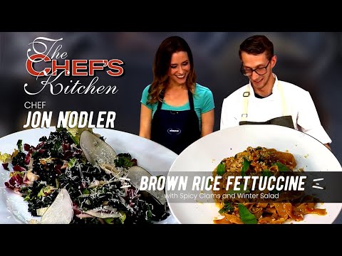 Boil pasta for 1.5-2 minutes, depending on thickness. Drain pasta and add to pan sauce. Simmer pasta with the sauce until saucy and coated, but not dry. Add chopped basil, fresh chive and parsley and finish with fresh lemon juice. Plate pasta and top with fresh chopped basil and toasted breadcrumb.