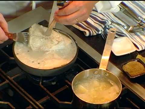 In a large pot heat about one cup of milk and 5 cups of water. Add salt, black peppercorns, bay leaf and one branch of thyme. Cook gently for 2-3 minutes.